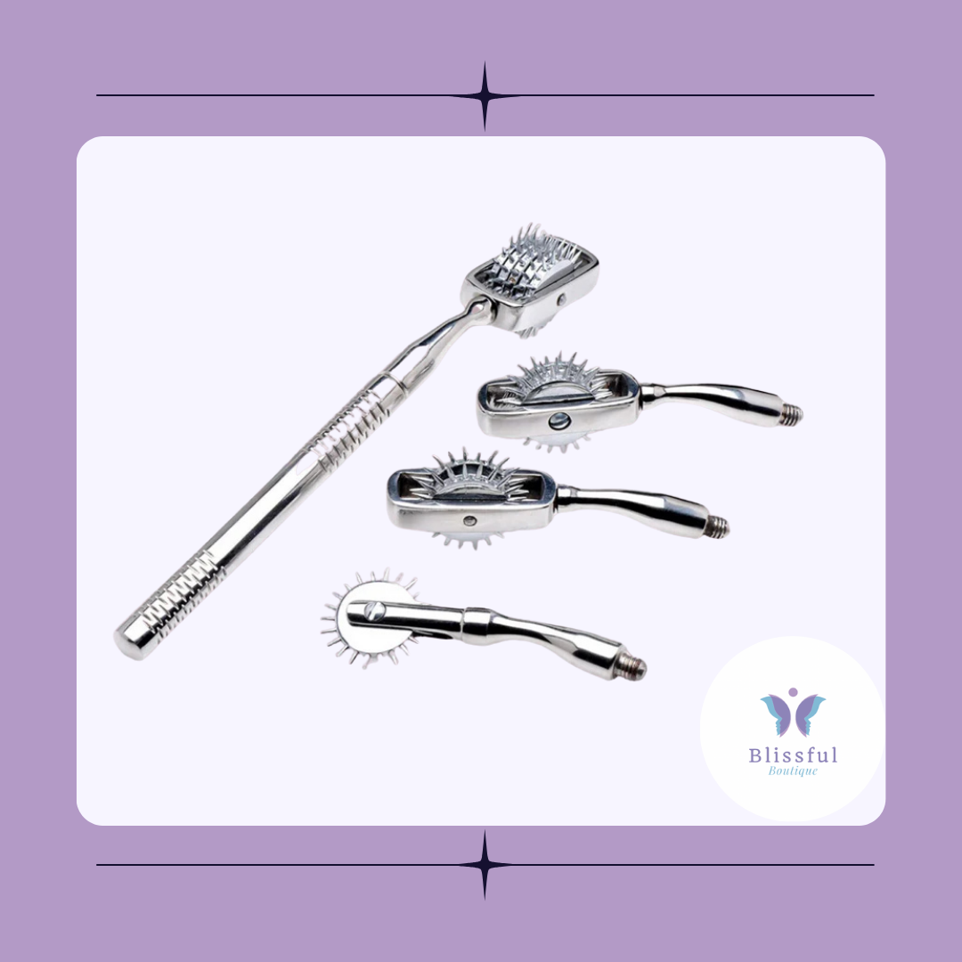 This Interchangeable 4 Pinwheel Set is sure to make their heart skip a beat! Each pinwheel set comes complete with a sleek chrome-plated handle and four erotic pinwheel attachments, each with varying numbers of heads so you can choose your weapon to suit the situation.